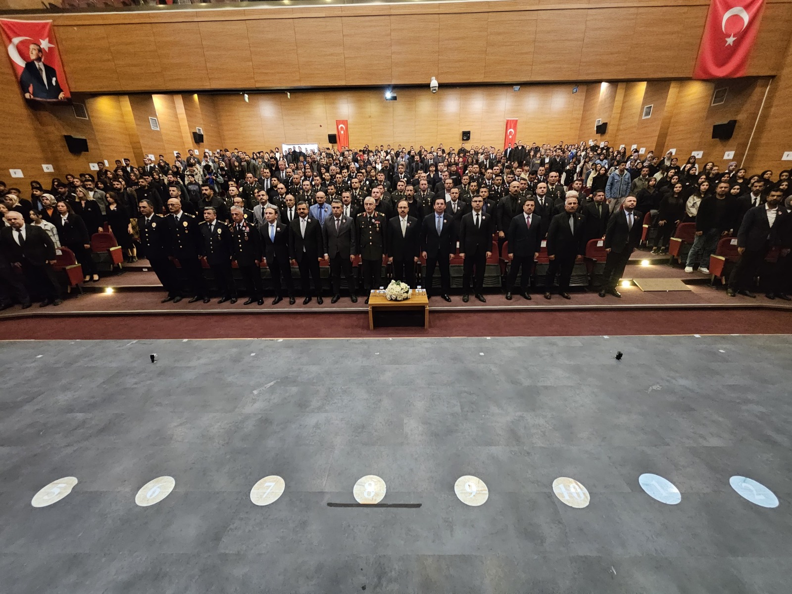Saatler 09.05’i gösterdiğinde siren çalınmasıyla saygı duruşunda bulunuldu, İstiklal Marşı okundu.