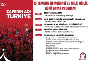 Saat 21.45’teki resmi tören, saygı duruşu ve İstiklal Marşı ile başlayacak; ardından Cumhurbaşkanı Recep Tayyip Erdoğan’ın hitapları, protokol konuşmaları, Kur’an-ı Kerim tilaveti ve ilahi dinletileri ile devam edecek. Sanat ve Farkındalık Etkinlikleriyle Gece Tamamlanacak Gece boyunca; Milli Eğitim Müdürlüğü tarafından hazırlanan şiir dinletisi, Mehteran konseri, 15 Temmuz Korosu’nun marş ve türküleri, Sinevizyon gösterimi ve Selâ okunması, gibi etkinliklerle 15 Temmuz ruhu yaşatılacak. Program, katılımcılara ikramların sunulmasıyla sona erecek.