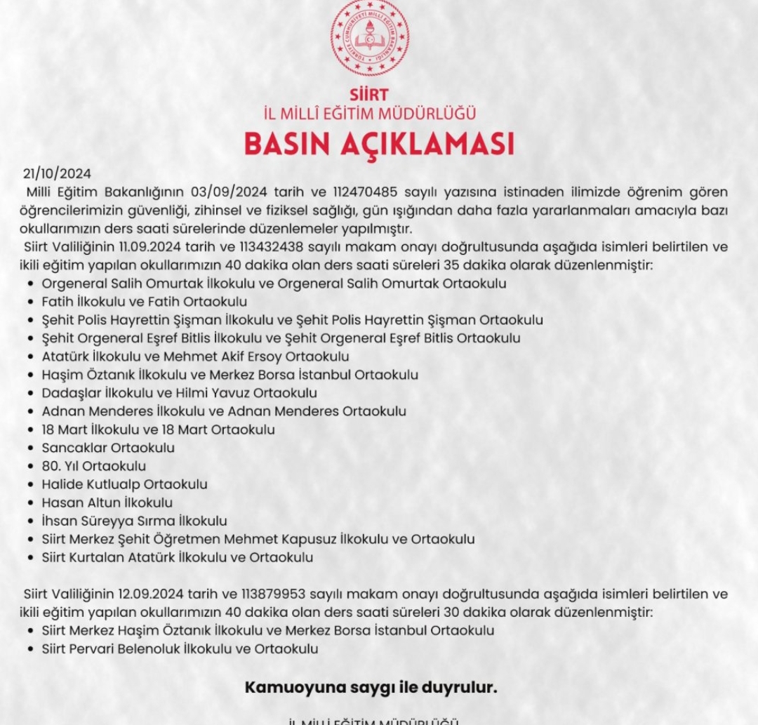 Siirt Valiliğinin 11.09.2024 tarih ve 113432438 sayılı makam onayı doğrultusunda aşağıda isimleri belirtilen ve ikili eğitim yapılan okullarımızın 40 dakika olan ders saati süreleri 35 dakika olarak düzenlenmiştir: