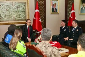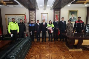 10 Nisan Polis Haftası ve Türk Polis Teşkilatı’nın 181. kuruluş yıl dönümü kutlama programı kapsamında, İl Emniyet Müdürü Necmettin Öztürk ve beraberindeki heyet, Siirt Valisi ve Belediye Başkan Vekili Dr. Kemal Kızılkaya’yı makamında ziyaret etti. Gerçekleştirilen ziyarette, Polis Haftası dolayısıyla yürütülen etkinlikler hakkında görüş alışverişinde bulunulurken, Vali Kızılkaya Türk Polis Teşkilatı’nın önemli görevler üstlendiğini vurguladı. Vali Kızılkaya, asayişin ve kamu güvenliğinin sağlanmasında büyük bir özveriyle, mesai mefhumu gözetmeksizin görev yapan polislerin Polis Haftası’nı ve Türk Polis Teşkilatı’nın 181. kuruluş yıl dönümünü kutlayarak, görevlerinde başarılar diledi. Ziyaret, günün anısına çekilen hatıra fotoğrafı ile sona erdi.