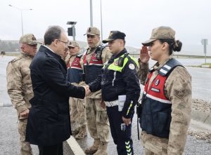 Siirt Valisi ve Belediye Başkan Vekili Dr. Kemal Kızılkaya, Ramazan Bayramı programı kapsamında güvenlik güçlerini görev başında ziyaret etti. Vali Kızılkaya, Kezer Jandarma Uygulama Noktası ile Kilit-1 Polis Uygulama Noktası’na gerçekleştirdiği ziyaretlerde, vatandaşların huzur ve güvenliği için gece gündüz görev yapan jandarma ve emniyet personelinin bayramını tebrik etti. Ziyaret sırasında görevli personelle sohbet eden Kızılkaya, bayram süresince yürütülen uygulama ve trafik denetimlerinin önemine dikkat çekerek, tüm personele çalışmalarında kolaylıklar diledi. Özverili hizmetlerinden dolayı güvenlik güçlerine teşekkür eden Kızılkaya, kamu düzeninin sağlanmasında gösterilen gayretin büyük önem taşıdığını vurguladı. Vali Kızılkaya’ya ziyaretlerinde, İl Jandarma Komutanı Uğur Özmen ve İl Emniyet Müdürü Necmettin Öztürk eşlik etti.